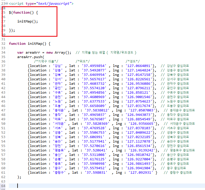 areaArr() 에 지역과 위/경도를 담는다.