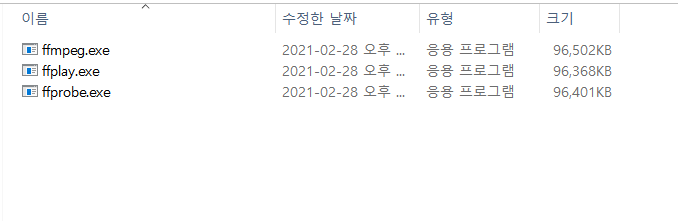 다운로드 후 ffmpeg 폴더가 생성되면 bin 폴더 안에 사진과 같이 파일들을 확인할 수 있다.