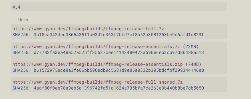 ffmpeg 사이트 접속시 가운데 window 클릭 후 .dev 를 들어가면 해당 릴리즈가 있음.