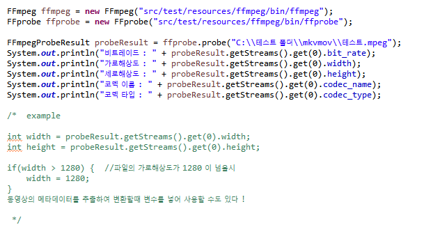 위의 사진의 주석처럼 동영상 정보를 추출하여 조건을 주면서 동영상 변환을 할 수 있다.