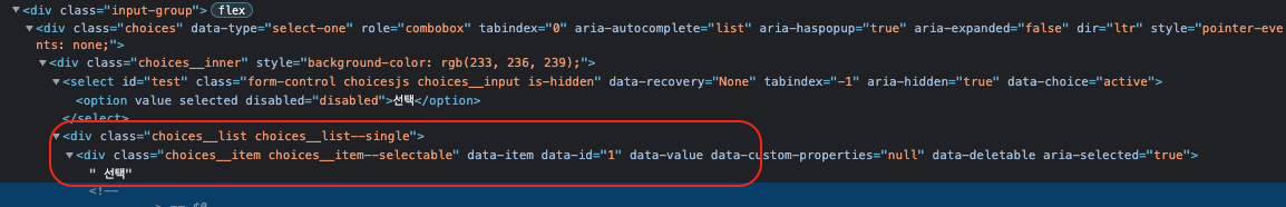 choicesjs 를 통해서 만들어진 select를 개발자도구를 통해 확인해보면 정말 div로 미친듯이 감싸져있다.