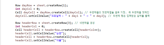 엑셀파일을 생성해주는 소스코드 위에다가 작성을 해주어야한다 ! ( 헷갈리면 전체소스 참고 )