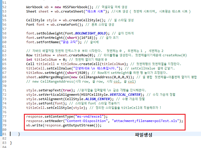 하단의 빨간 네모는 엑셀을 파일로 생성해주는 부분.