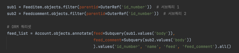 sub2 = Feedcomment.objects.filter(parentid=OuterRef('id_number')) # 서브쿼리 2