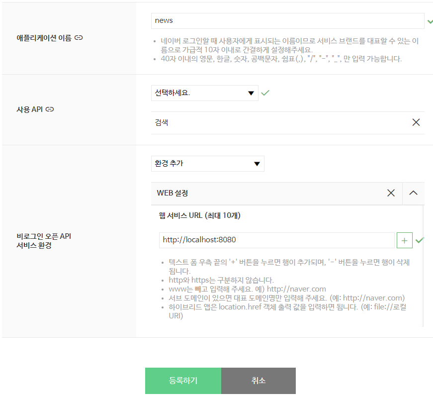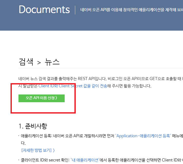 ■ 먼저 개발자 가이드에서 뉴스검색 애플리케이션을 등록해야합니다.