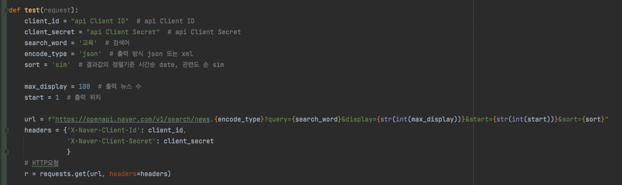 6. 해당 URL과 헤더에 클라이언트 값을 넣어서 requests를 통해 전달합니다.