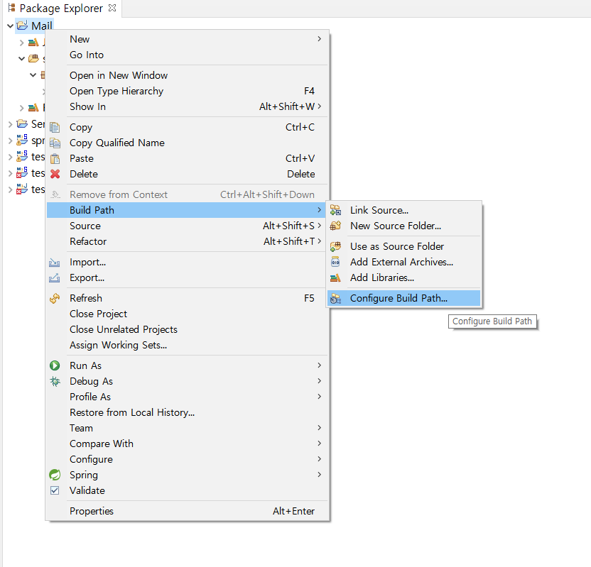 프로젝트 우클릭 > Build Path > Configure Build Path.. 클릭 후