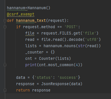 파이썬 장고를 통해 txt 파일 업로드 후 txt파일의 내용을 읽어 제일 많이 언급된 키워드를 찾는 방법입니다.